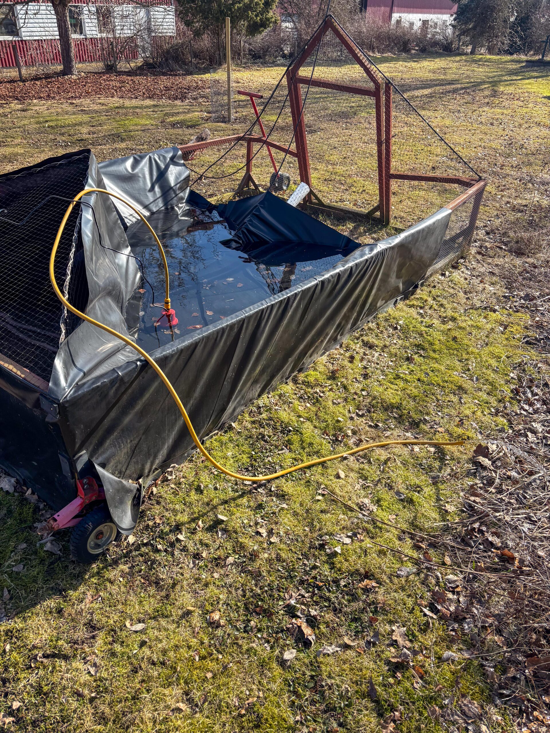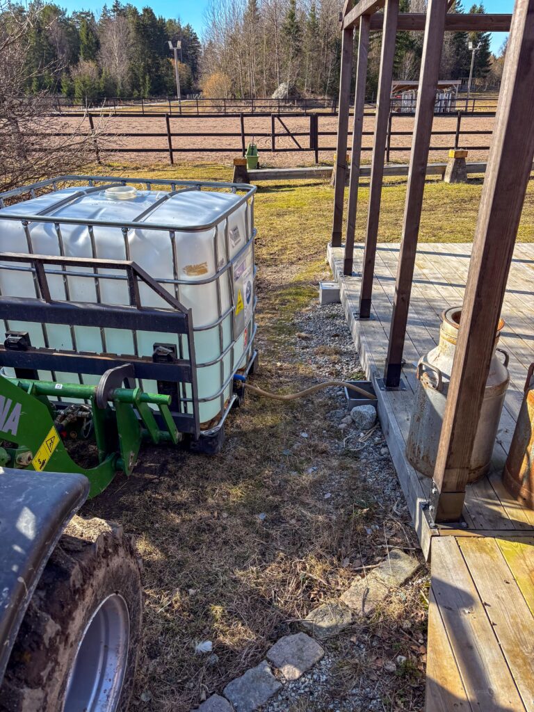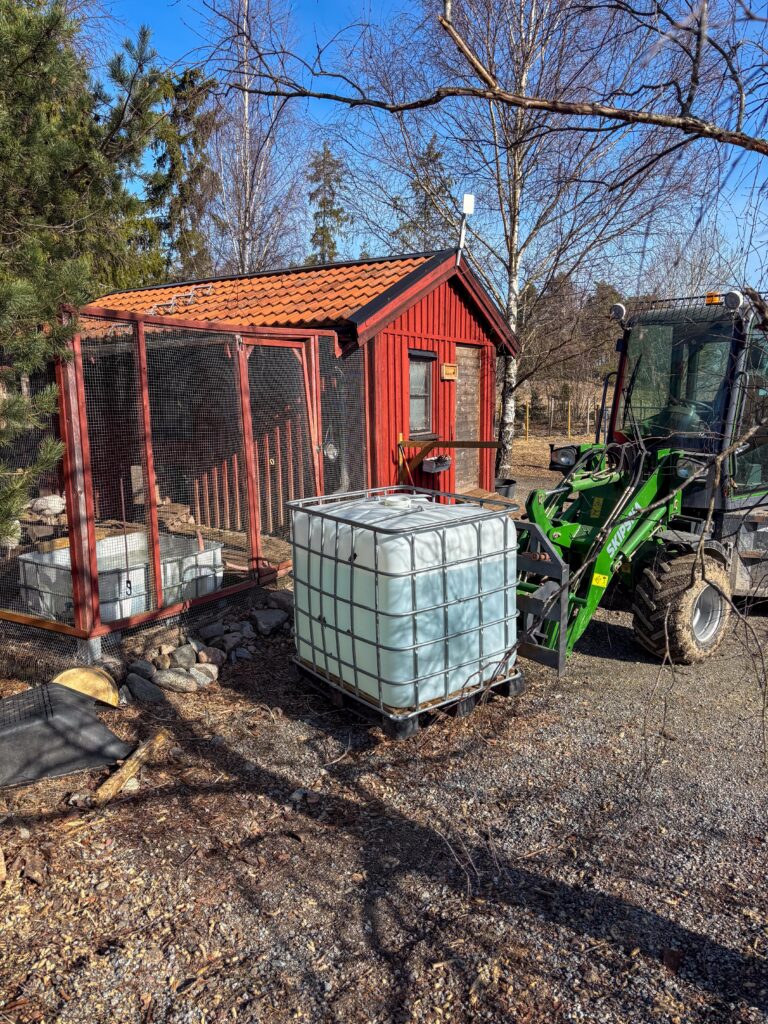 Efter att ha jämnat till och paddat runt brunnen kunde jag installera den nya pumpen. Alla kranar hade klarat vintern så jag kunde fortsätta med lite annat rutinarbete som att väga upp hö och vattna i orangeriet. Medan jag satte ett batteri för RC-bilen på laddning passade jag på att flytta veden från förra helgen upp till vedlagret och klöv en kärra till som så att jag har något enkelt att börja med imorgon.